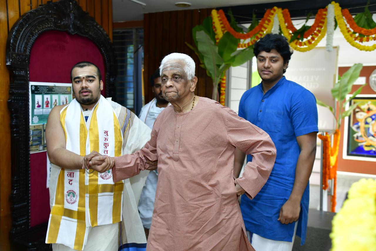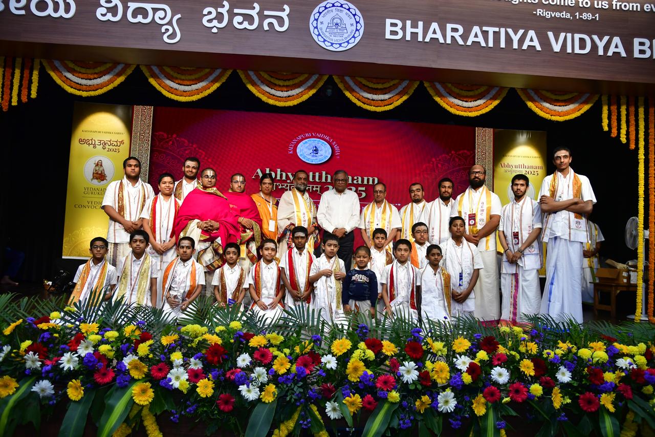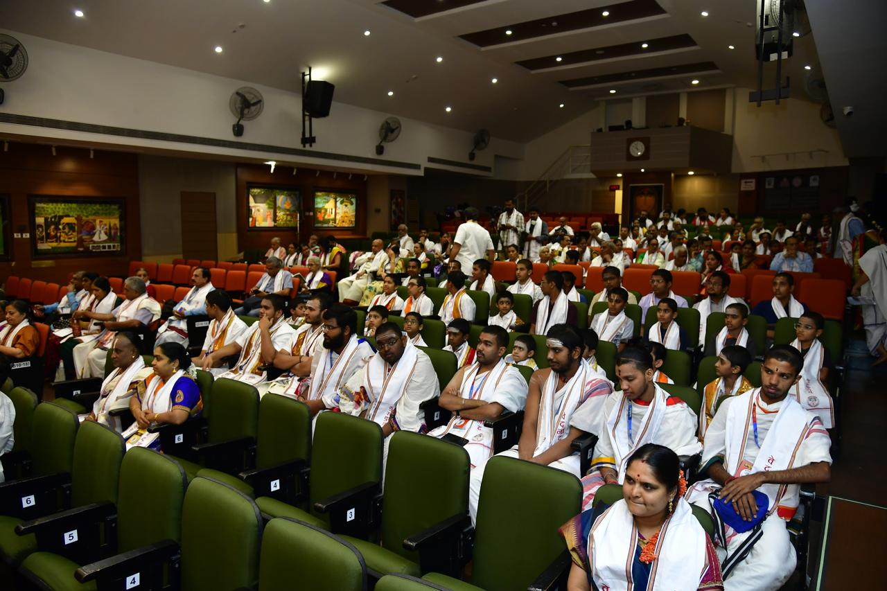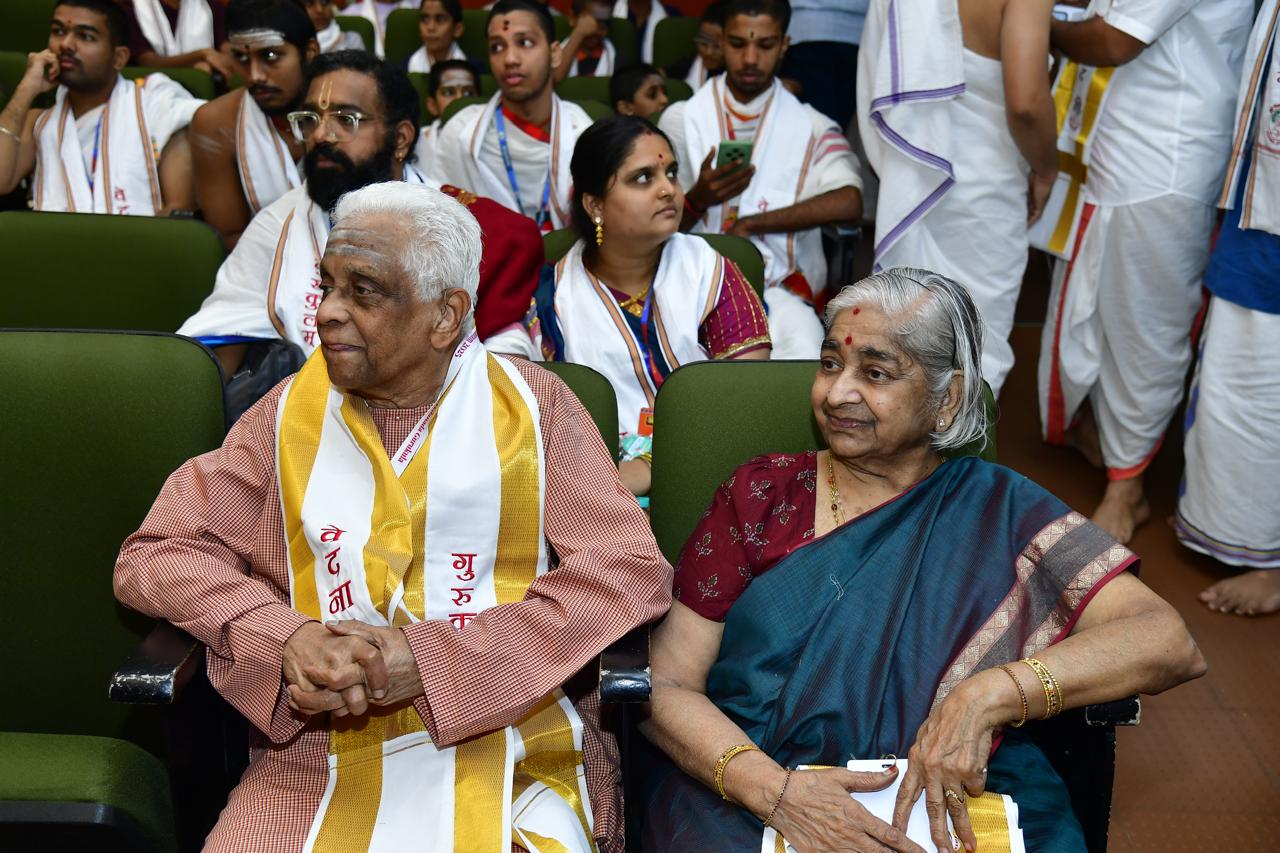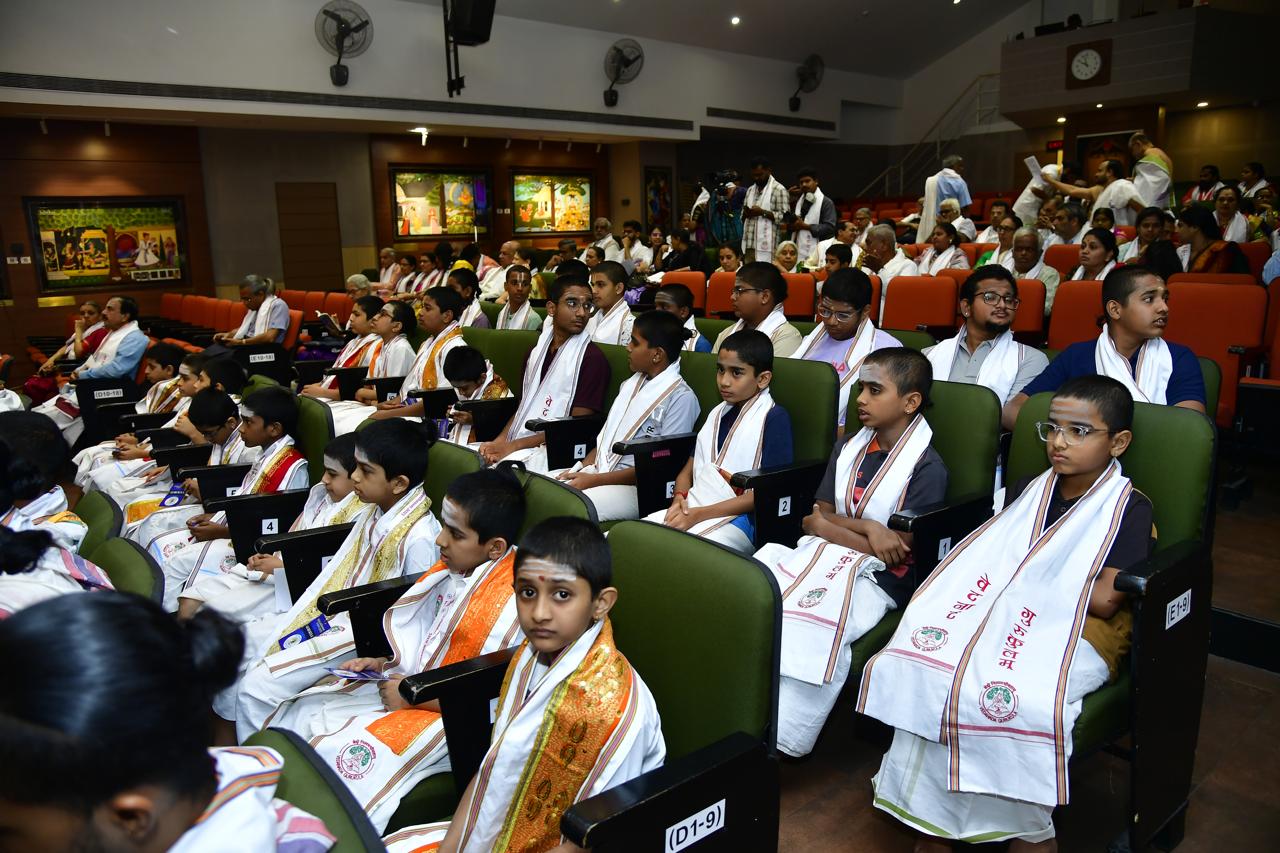 To acknowledge and reward the students of the Gurukula, a first of its kind Vedic Convocation Ceremony was held on May 15th, 2022 at Bharatiya Vidya Bhavan. The programme commenced with a beautiful musical performance by Neyveli Shri R Santhana Gopalan and group. This was followed by the welcoming of the chief guests on to the stage. The chief guests for the event were Hon. Smt. Nirmala Sitharaman, Finance Minister, Government of India, H.H. Yaduveer Krishnadatta Chamaraja Wadiar, Mysore, Prof. Sri. K.E.Devanathan, Vice-Chancellor, Sanskrit University, Karnataka. The convocation honoured 8 students in total of which 3 had completed 12 years at the Gurukula to attain the qualification of Ghanapaati. The event had speeches by the guests of honour and members of the Gurukula. Words of appreciation and encouragement were shared by the Chief Guest and concluded with a photo session of the students and guests of honour.